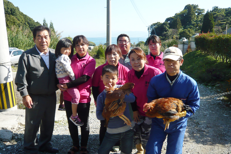 天草大王は県より生まれてすぐのヒナで来ます。とても小さくかわいいんです。ですが、生死が不安定で温度の調節からとりかかります。時間を見てはヒナ部屋の温度を確認します。その時は夜中まで見に行きます。 落ち着いたら飼です。人と同じで、毎日の飼の量で食いつきのよい鶏、悪い鶏もあります。基本の県指導の飼に加えて、せっかく天草で天草大王を育てるのですから、海から取って来た“海藻”地元でとれる“いりこ、ちりめん”地元の豆腐屋の“おから”を混ぜて与えています。鶏もおいしのは分かるようです。すくすく育ち、出荷前の天草大王は色つやもよい鶏が出来ました。 まだまだ試行錯誤はしますが、よりよい鶏を一味ちがう天草大王を育てていきます。 海岸沿いの静かな山合いのたたずまいで、育てています。できる限り自然に近い環境で育つ「天草大王」は非常に「元気」が良く・肉質・味ともにご満足頂けると確信致しております。