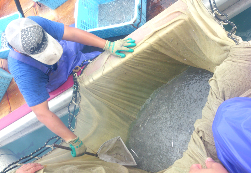 ちりめん漁は2隻の網船と1隻の電波船で行います。長く大きな網を網船で同時に巻き上げて水揚げ、新鮮なちりめんを電波船で素早く自社工場に運び自動釜で茹で揚げます。自動釜を使う事で、チリメンジャコ1匹1匹にムラなく火が通りプリプリの釜揚げちりめんが茹で揚がります。そこからさらに潮風と天日干し半日から丸一日かけて乾燥させます。