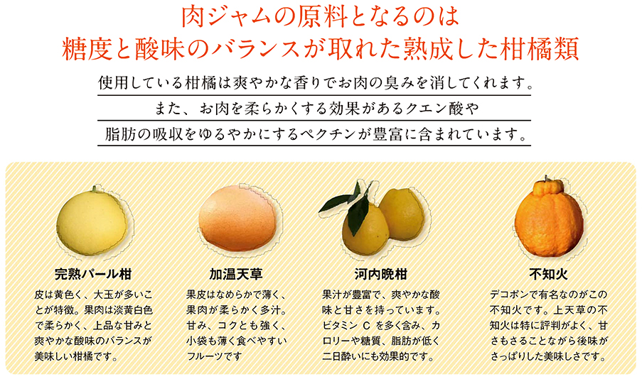 1960年、温州みかん栽培から始まり、今では天草オレンジを始め、デコポン(不知火)、天草晩柑にパール柑と時代と共にたくさんの種類をつくってきました。親の代から大地を受け継ぎ、そしてこれからは息子さんの世代へ。毎年、じっくりとみかんに向き合い研究を重ね味の良い柑橘栽培の継続を目指しています。今では奥さんがつくる規格外品を使ったジャムなども美味しいと評判に。自演の食材を余すところなく使い、地元でも人気の加工品です。